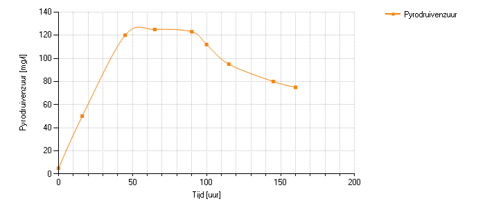 Pyrodruivenzuur Bron: brouw-bier.nl - Alles wat de amateur bierbrouwer of bierliefhebber moet weten over het brouwen van bier bierliefhebber moet weten over het brouwen van bier Pyrodruivenzuur is een organisch zuur dat een belangrijke functie vervult tijdens de stofwisseling. Bij de glycolyse wordt glucose omgezet in pyrodruivenzuur (2-oxopropaanzuur, C3H4O3). Bij de omzetting van 1 molecuul glucose tot 2 moleculen pyrodruivenzuur worden twee moleculen adenosinetrifosfaat (ATP) gevormd. Reactievergelijking: C6H12O6 + 2 Pi + 2 ADP + 2 NAD+ → 2 C3H4O3 + 2 ATP + 2 NADH + 2 H+ + 2 H2O NAD+ fungeert hier als elektronenacceptor. Elk molecuul NAD neemt 2 elektronen op. Dit proces vindt plaats in het cytoplasma. Onderstaande afbeelding geeft de toe- en afname weer van de concentratie pyrodruivenzuur tijdens het gistingsproces van bier.